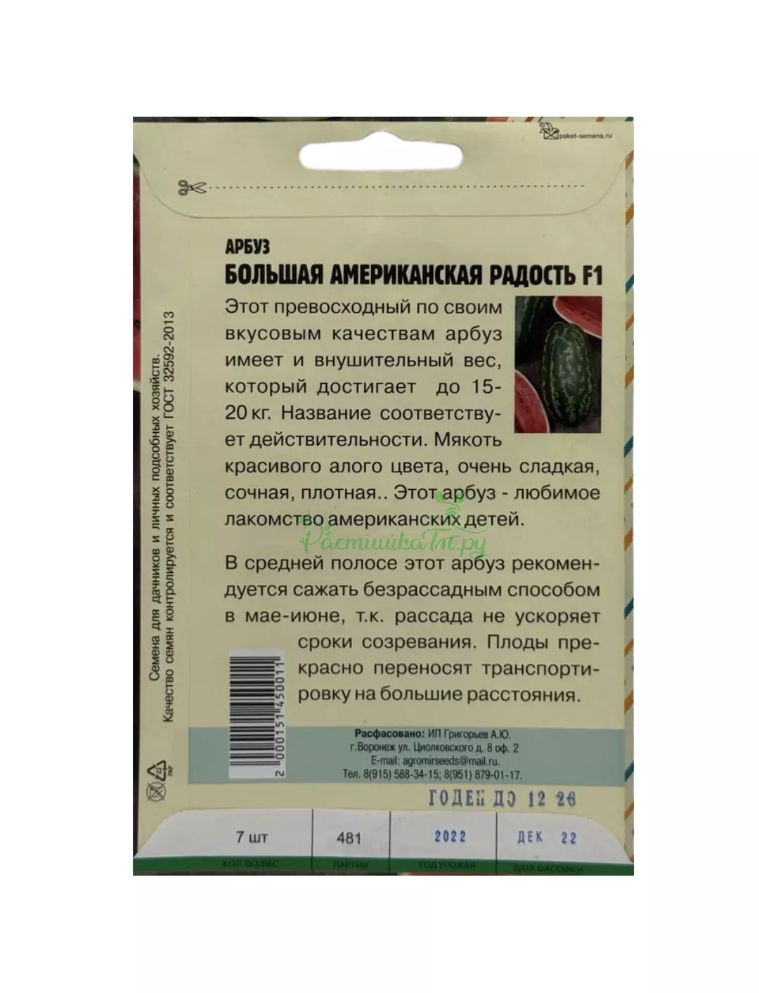 Цвет плода - темно-зеленый. Срок созревания - среднеранний. Вес достигает 15 - 20 кг , форма плода - удлиненно овальный. Мякоть - ярко-красная.