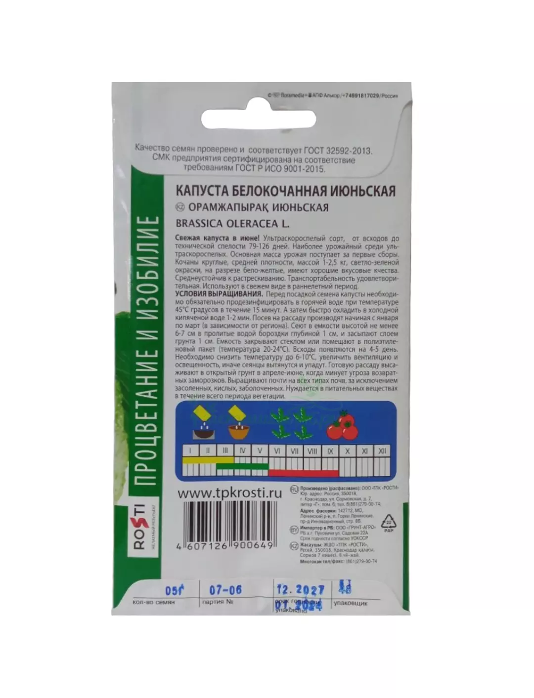 УСЛОВИЯ ВЫРАЩИВАНИЯ: перед посадкой семена капусты необходимо обязательно продезинфицировать в горячей воде при температуре 45 °С градусов в течение 15 минут. А затем быстро охладить в холодной кипяченой воде 1-2 мин. Посев на рассаду производят начиная с января по март (в зависимости от региона).