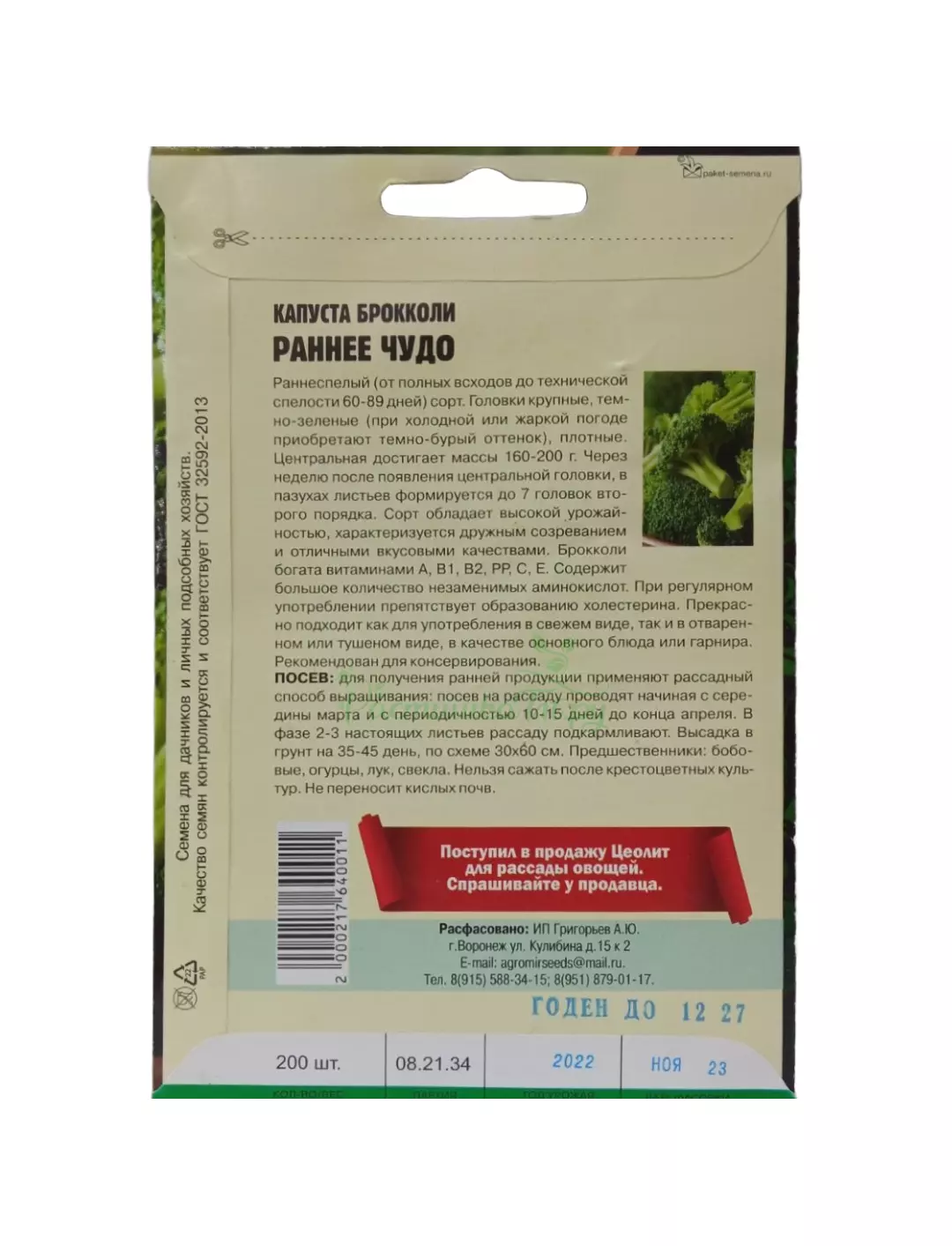 Раннеспелый (60-89 дней от всходов до технической спелости) сорт. Лист мелкий, цельный, с черешком, темно-зеленый с голубовато-сизоватым оттенком, восковой налет средний. Головка темно-зеленая, среднеплотная, высотой 5-8 см. После срезки быстро отрастают головки-отпрыски. Головки плотные, крупные, массой 160-200 г. Вкусовые качества хорошие. Сорт характеризуется дружным созреванием урожая. Рекомендован для консервирования.
