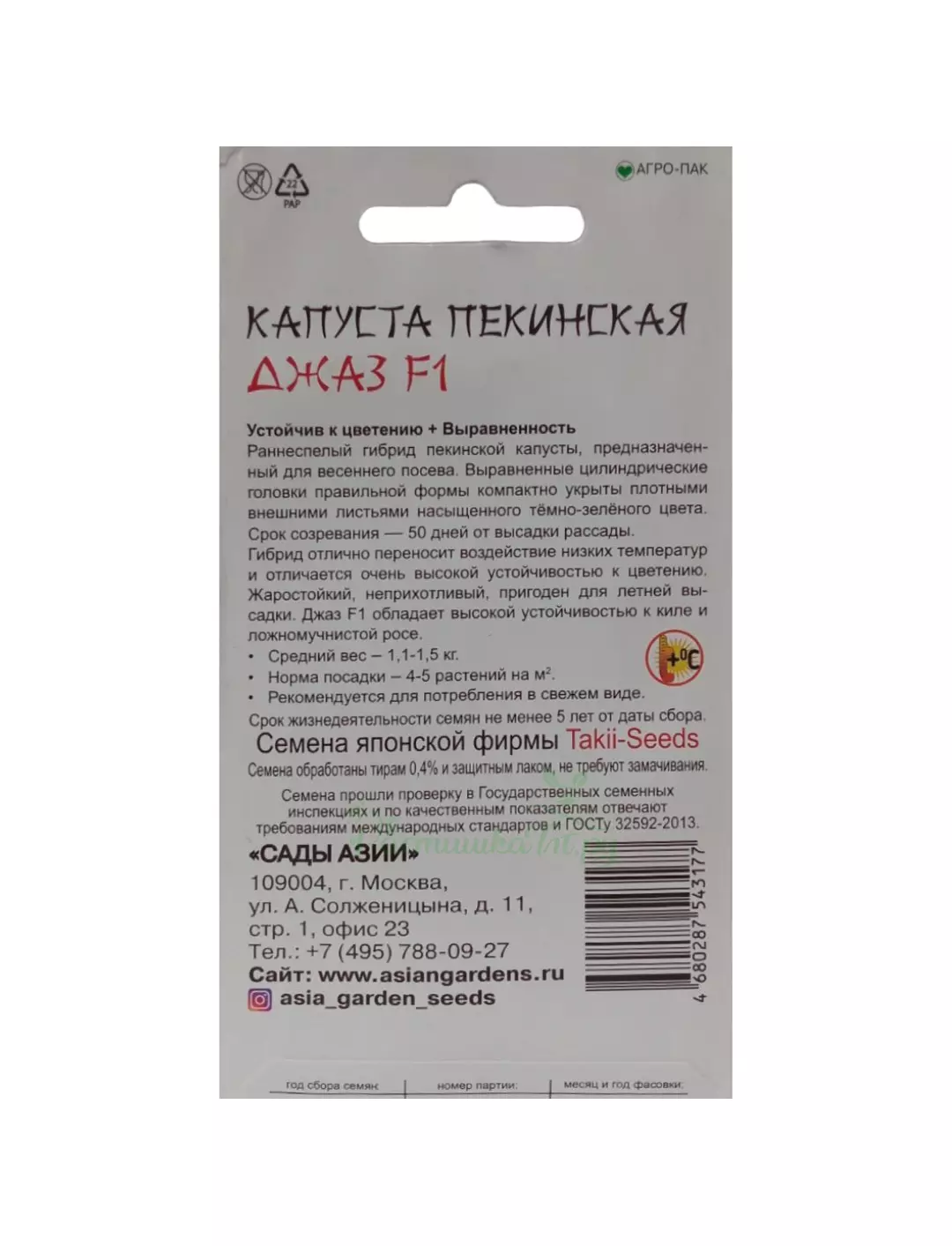 Раннеспелый гибрид пекинской капусты, предназначенный для весеннего посева. Выравненные цилиндрические головки правильной формы компактно укрыты плотными внешними листьями насыщенного тёмно-зелёного цвета. Срок созревания - 50 дней от высадки рассады. Средний вес - 1,1-1,5 кг. Гибрид отлично переносит воздействие низких температур и отличается очень высокой устойчивостью к цветению. Жаростойкий, неприхотливый, пригоден для летней высадки. Джаз F1 обладает высокой устойчивостью к киле и ложномучнистой росе. Рекомендуется для потребления в свежем виде.