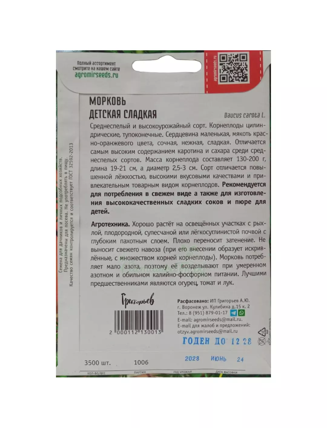Один из самых лучших сортов среднеспелой моркови. От всходов до созревания корнеплодов 108-118 дней. По вкусовым характеристикам и значительному содержанию каротина и сахаров в корнеплодах чудесно подходит для детского питания в свежем виде, пюре и соках. Сорт высокоурожайный, формирует красивые корнеплоды- цилиндры, длиной 19-21 см, массой до 200 г. Сердцевина маленькая, мякоть красно-оранжевая, сочная, нежная, сладкая. Отличается самым высоким содержанием каротина и сахара среди среднеспелых сортов. Рекомендуется для потребления в свежем виде, для изготовления качественных вкусных соков и пюре для детей. Урожайность 8-10 кг/м2. Высевают семена в хорошо подготовленную почву. При образовании 2-3 настоящих листьев растения прореживают на расстоянии 4 -5 см в рядке. Для нормального развития моркови требуется много калия. Урожай собирают до начала заморозков.