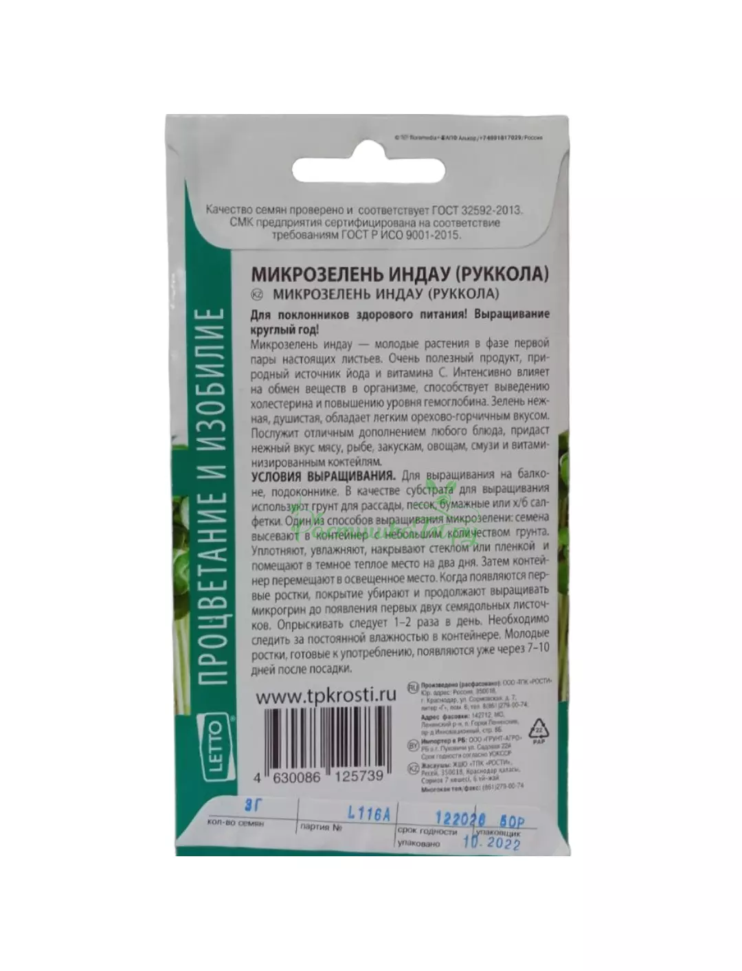 Микрозелень индау – молодые растения в фазе первой пары настоящих листьев. Очень полезный продукт, природный источник йода и витамина С. Интенсивно влияет на обмен веществ в организме, способствует выведению холестерина и повышению уровня гемоглобина. Зелень нежная, душистая, обладает легким орехово-горчичным вкусом. Послужит отличным дополнением любого блюда, придаст нежный вкус мясу, рыбе, закускам, овощам, смузи и витаминизированным коктейлям.