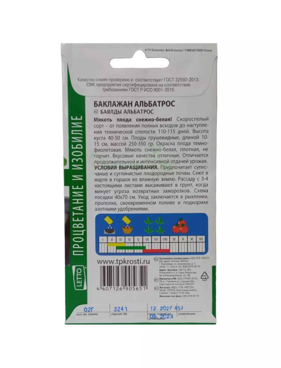 Скороспелый сорт - от появления полных всходов до наступления технической спелости 110-115 дней. Высота куста 40-50см. Плоды грушевидные, длиной 10-15 см, массой 250-350 гр. Окраска плода темно-фиолетовая. Мякоть снежно-белая, плотная, не горчит. Вкусовые качества отличные. Отличается продолжительной и интенсивной отдачей урожая.