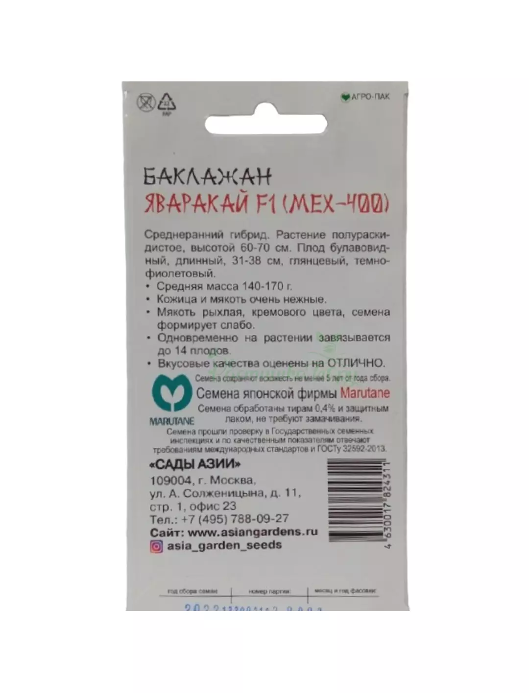 Средний гибрид баклажана имеет полураскидистую форму с высотой около 60-70 см, а его плоды вытянутые длиной около 30-35 сантиметров, темно-фиолетовые. Мякоть у них нежная, рыхлая, кремового цвета. Формирование семечек слабое, одновременно на растении может быть до 14 завязей. Семена жизнеспособны в течение не менее 6 лет после сбора.