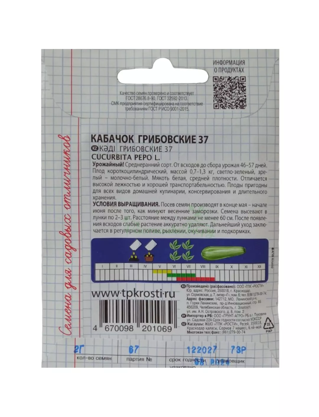 Среднеранний сорт. От всходов до сбора урожая 46-57 дней. Плод цилиндрический, массой 0,7-1,3 кг, светло-зеленый, зрелый - молочно-белый. Мякоть белая, средней плотности. Отличается высокой лежкостью и хорошей транспортабельностью. Плоды пригодны для всех видов домашней кулинарии, консервирования и длительного хранения.