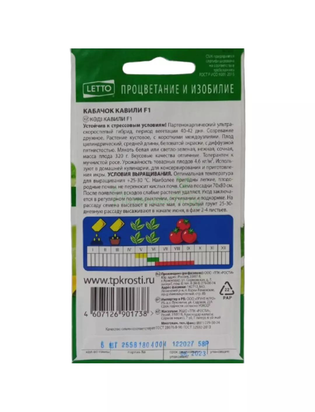Партенокарпический, ультраскороспелый гибрид, период вегетации 40-42 дня. Созревание дружное. Растение кустовое, с короткими междоузлиями. Плод цилиндрический, средней длины, беловатой окраски с диффузной пятнистостью. Мякоть белая или светло-зеленая, нежная, сочная, масса плода 320г. Вкусовые качества отличные. Толерантен к мучнистой росе. Используется в домашней кулинарии, консервирования и приготовления икры.