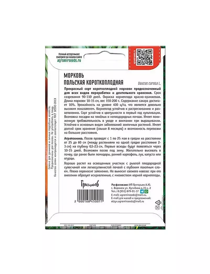 Прекрасный сорт короткоплодной моркови предназначенный для всех видов переработки и длительного хранения. Срок созревания 90-110дней. Окраска корнеплода красно-оранжевая. Длина моркови 10-15см, вес 150-200г.Содержание сахара достигает 10%.