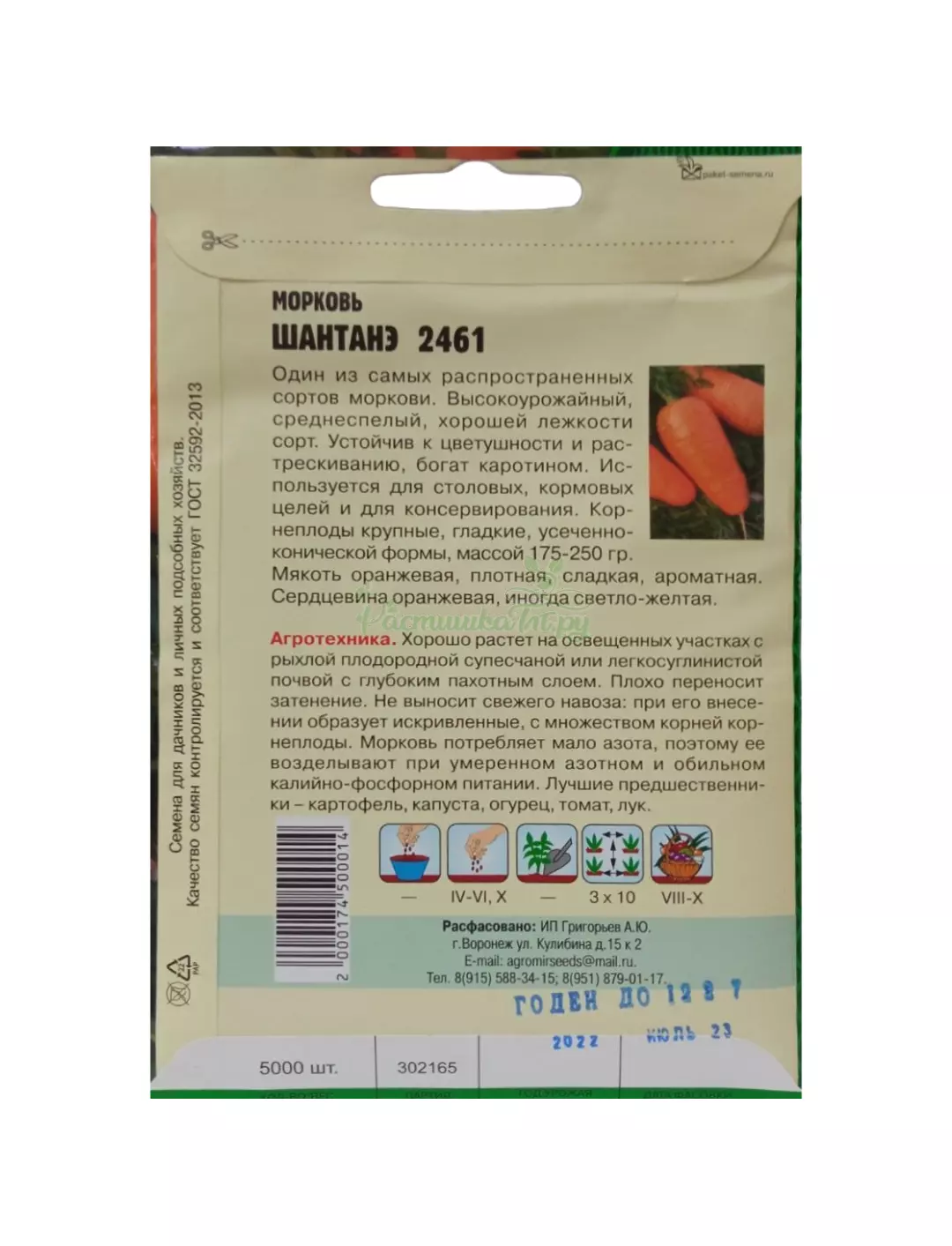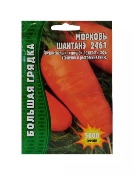 Широко известный сорт среднераннего срока созревания. Корнеплоды конические, длиной 12-15 см, массой 100-200 г, оранжевой окраски, хороших вкусовых качеств. Мякоть плотная, сладкая, ароматная, сочная. Отличительной особенностью сорта является стабильное получение высоких урожаев. Корнеплоды ШАНТАНЭ 2461 хорошо хранятся зимой.