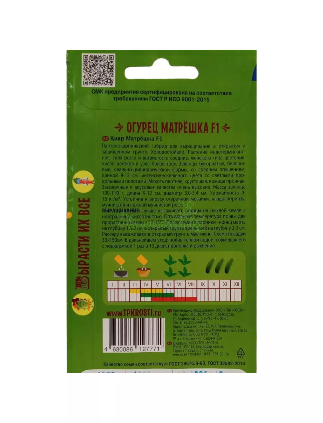 Партенокарпический гибрид для выращивания в открытом и защищенном грунте. Холодостойкий. Зеленцы бугорчатые, белошипые, овально-цилиндрической формы, со средним опушением, длиной 9-12 см, интенсивно-зеленого цвета со светлыми продольными полосами. Мякоть плотная, хрустящая, кожица прочная. Засолочные и вкусовые качества очень высокие. Масса зеленца 100-110 г, длина 9-12 см, диаметр 3,0-3,4 см . Устойчив к вирусу огуречной мозаики, кладоспориозу, мучнистой и ложной мучнистой росе.