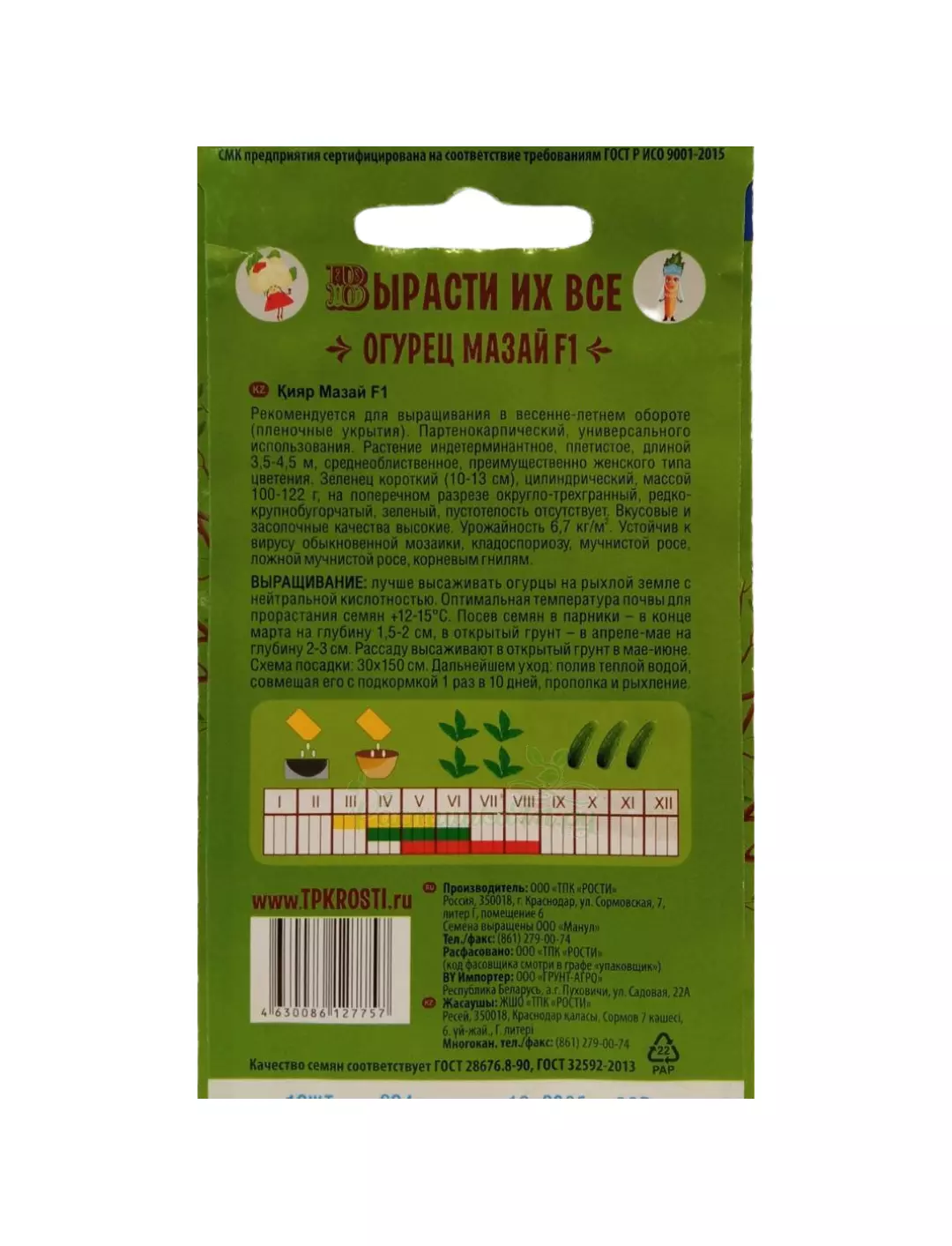 Рекомендуется для выращивания в весенне-летнем обороте (пленочные укрытия). Партенокарпический, универсального использования. Растение плетистое, длиной 3,5-4,5 м, среднеоблиственное, преимущественно женского типа цветения. Зеленец короткий (10-13 см), цилиндрический, массой 100-122 г, на поперечном разрезе округло-трехгранный, пустотелость отсутствует. Вкусовые и засолочные качества высокие. Устойчив к вирусу обыкновенной мозаики, кладоспориозу, мучнистой росе, ложной мучнистой росе, корневым гнилям.