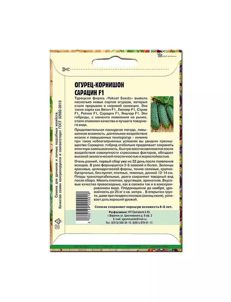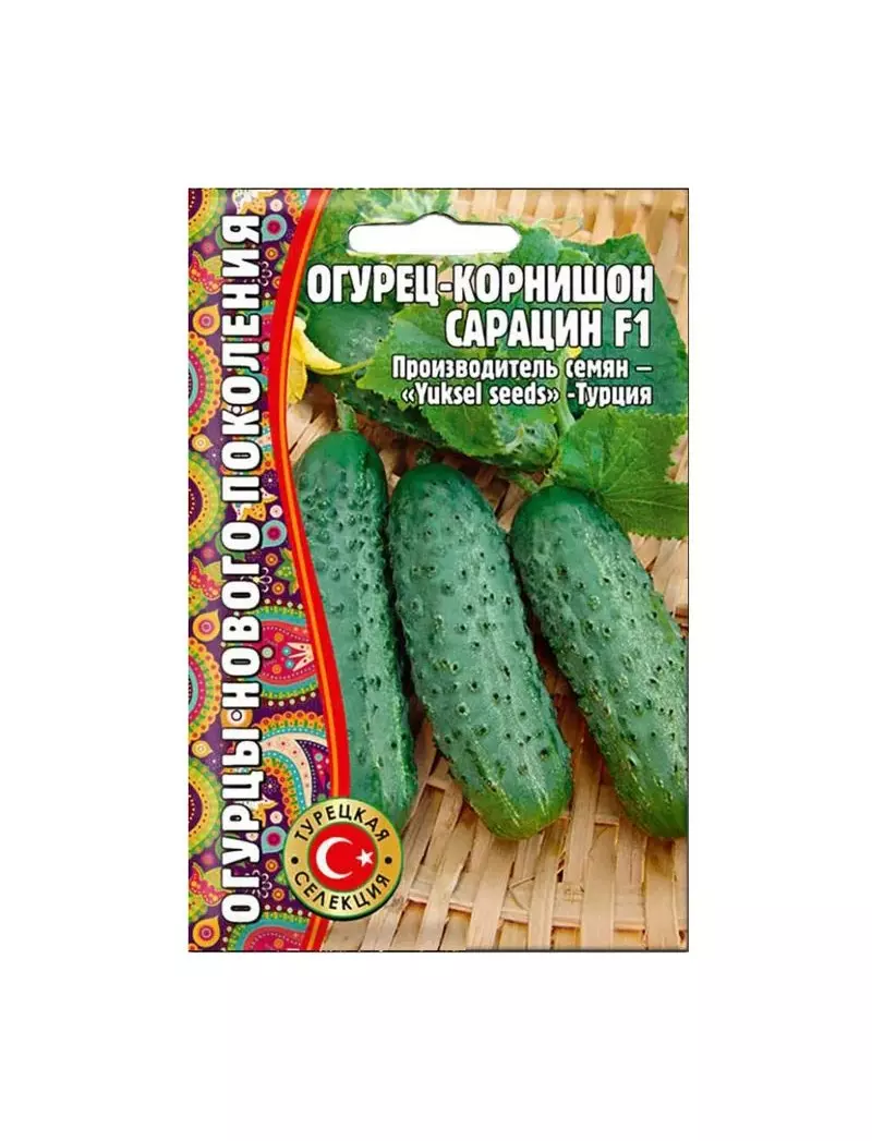 Огурец Сарацин F1 - это гибрид огурца раннего срока созревания, выведенный в Турции селекционерами фирмы Юксел Сидс (Yuksel Seeds). Зеленцы цилиндрической формы, среднебугорчатые, длиной 12 — 15 см, массой 80 — 90 грамм. Кожица плотная, тонкая, темно-зеленая, без белых полосок. Опушение очень частое. Шипы белые, колючие. Мякоть вкусная, ароматная. Урожайность товарных плодов в первый месяц плодоношения — 10 — 11 кг/кв.м, за весь период вегетации — около 20 кг/кв.м. Сорт салатный, но подойдет и для заготовок на зиму. Для консервирования плоды лучше снимать в стадии корнишона.