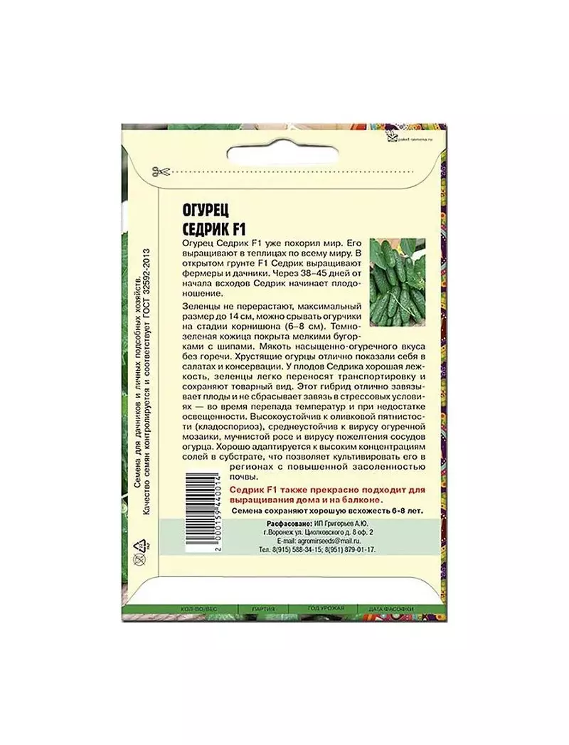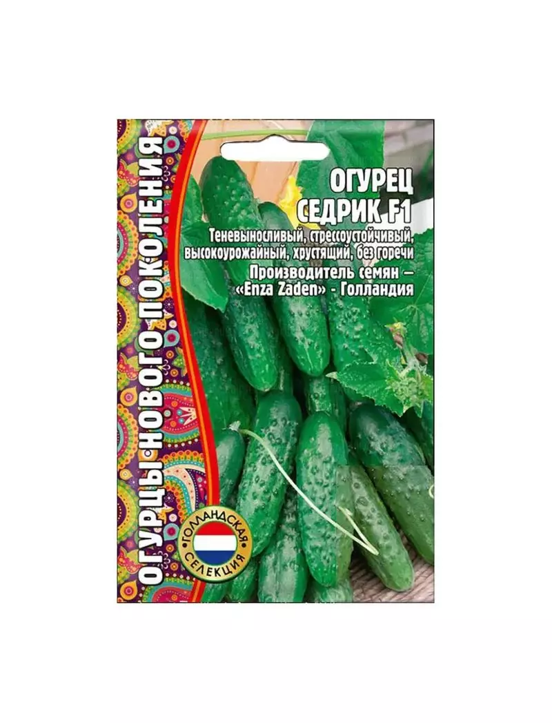 Огурец Седрик F1 уже покорил мир. Его выращивают в теплицах по всему миру. В открытом грунте F1 Седрик выращивают фермеры и дачники. Через 38–45 дней от начала всходов Седрик начинает плодоношение. Зеленцы не перерастают, максимальный размер до 14 см, можно срывать огурчики на стадии корнишона (6–8 см). Темно-зеленая кожица покрыта мелкими бугорками с шипами. Мякоть насыщенно-огуречного вкуса без горечи. Хрустящие огурцы отлично показали себя в салатах и консервации. У плодов Седрика хорошая лежкость, зеленцы легко переносят транспортировку и сохраняют товарный вид. Этот гибрид отлично завязывает плоды и не сбрасывает завязь в стрессовых условиях — во время перепада температур и при недостатке освещенности. Высокоустойчив к оливковой пятнистости (кладоспориоз), среднеустойчив к вирусу огуречной мозаики, мучнистой росе и вирусу пожелтения сосудов огурца. Хорошо адаптируется к высоким концентрациям солей в субстрате, что позволяет культивировать его в регионах с повышенной засоленностью почвы. Седрик F1 также прекрасно подходит для выращивания дома и на балконе.