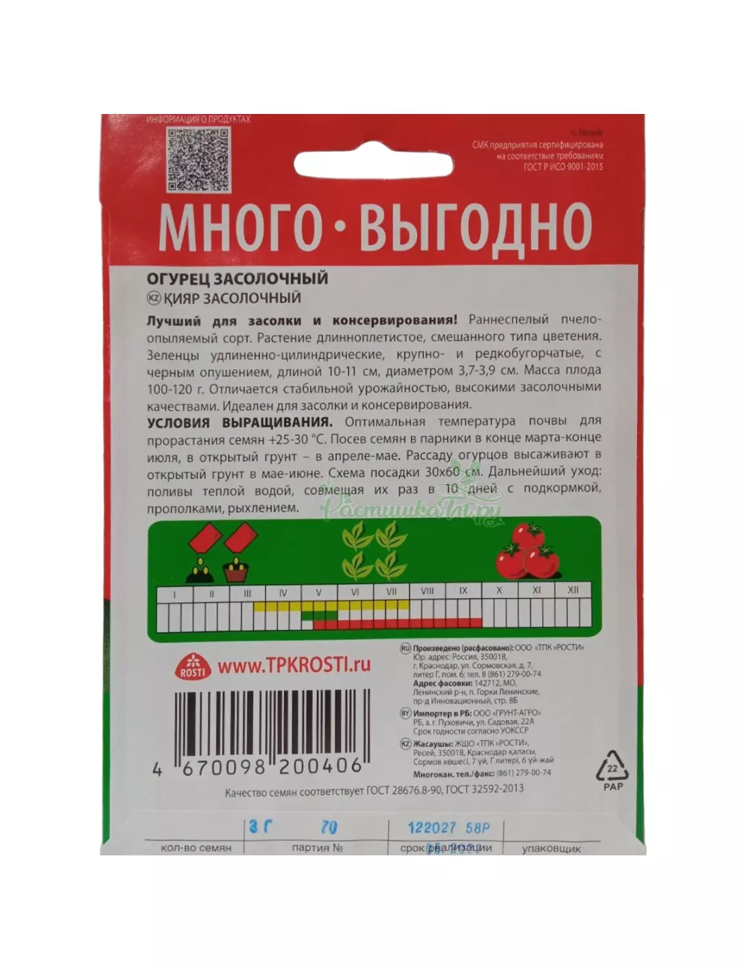 Раннеспелый, пчелоопыляемый сорт. Растение длинноплетистое, смешанного типа цветения. Зеленцы удлиненно-цилиндрические, крупно и редкобугорчатые, длиной 10-11 см, диаметром 3,7-3,9 см. Масса плода 100-120 г. Отличается стабильной урожайностью, высокими засолочными качествами. Идеален для засолки и консервирования.