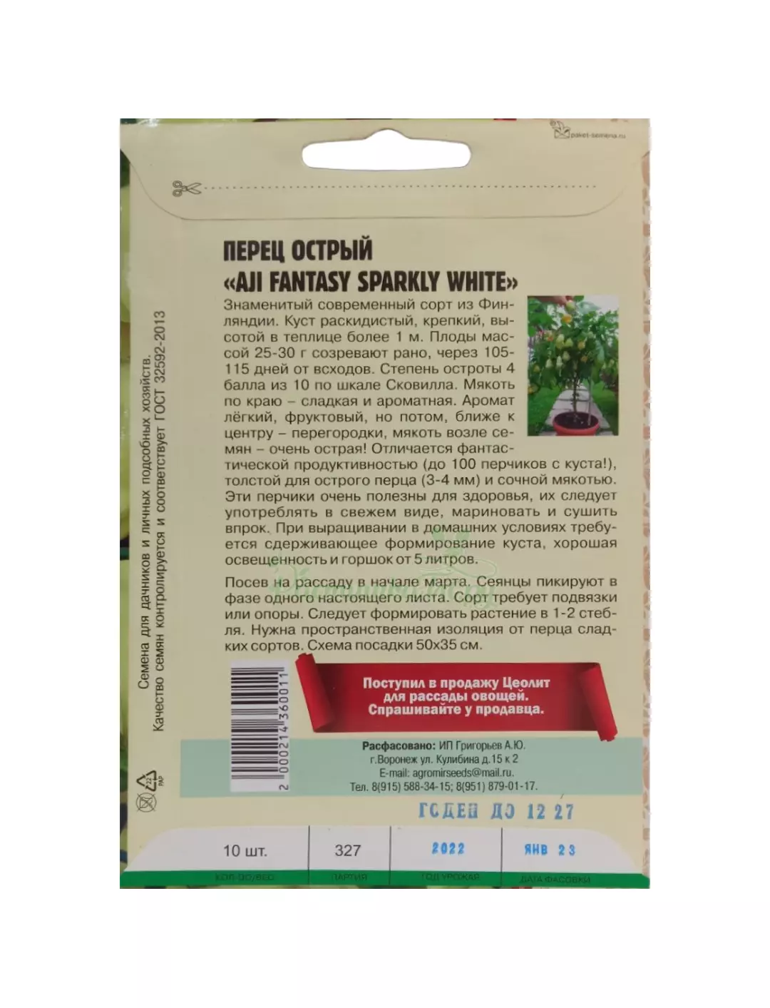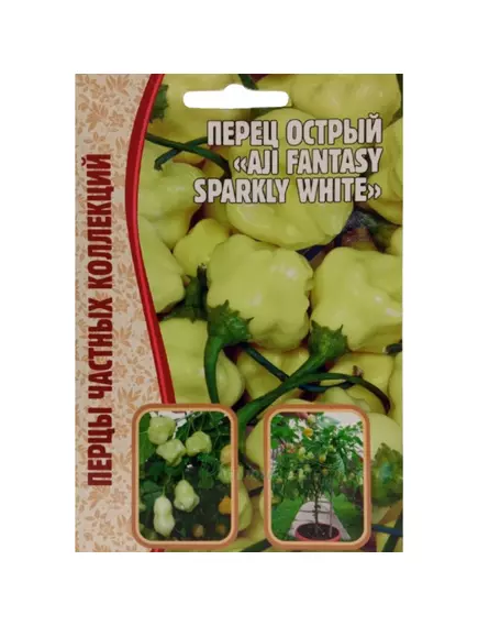 Перец острый Айджи Уайт Фэнтези - знаменитый современный сорт из Финляндии, уже полюбившийся ценителям острого перца по всему миру. Известен гурманам как "Aji Fantasy Sparkly White", степень остроты 4 балла из 10 по шкале Сковилла. По сравнению со своим прародителем – жёлтым перцем-чили "Aji Fantasy", отличается фантастической продуктивностью (до 100 перчиков c куста), более толстой и сочной мякотью, сбалансированной "мягкой" остротой (семена очень острые), сладковатым вкусом и фруктовым ароматом.