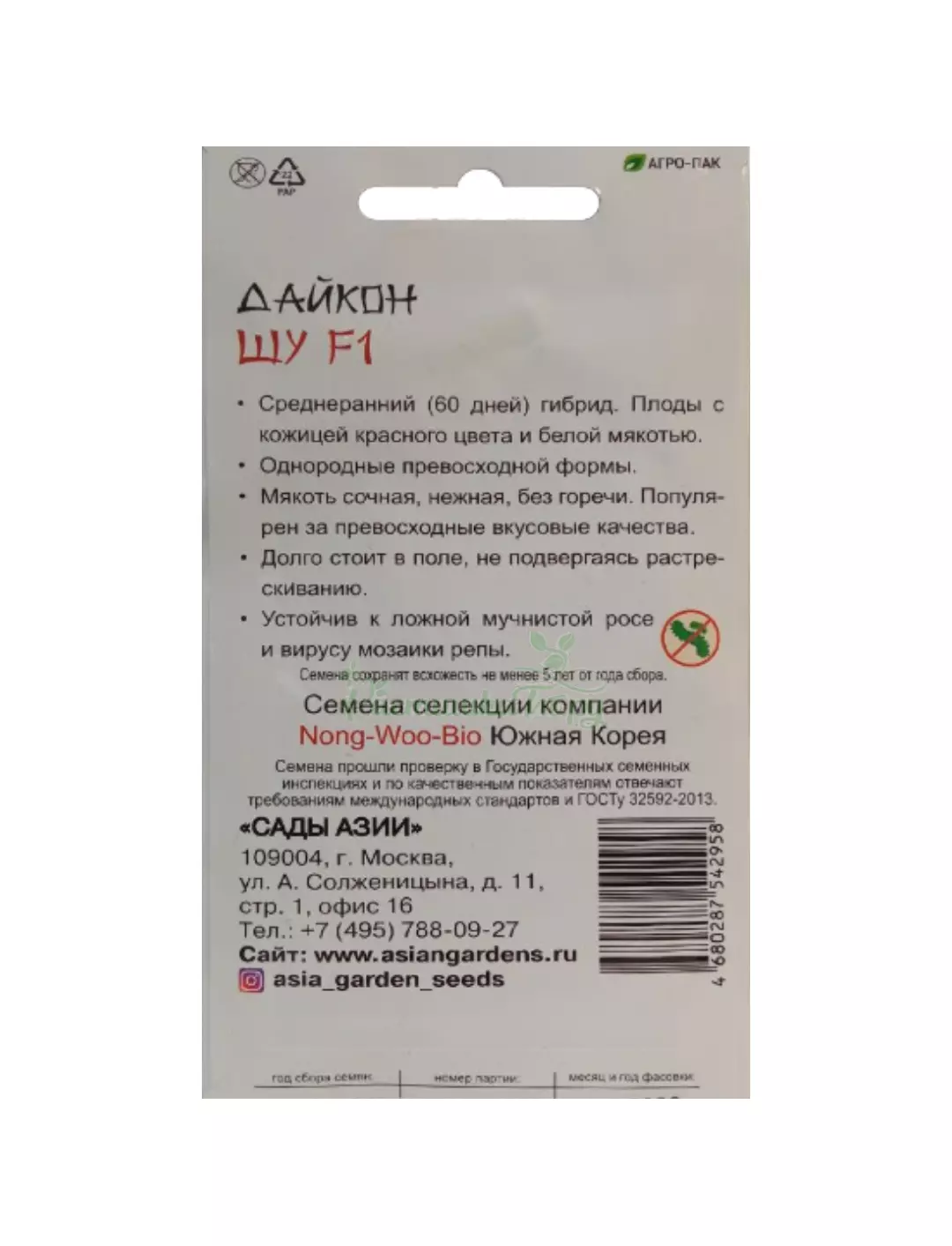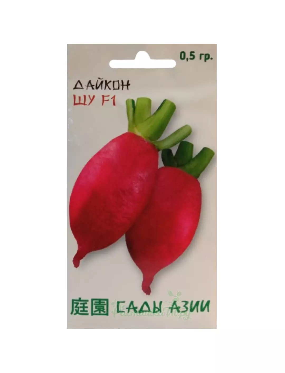 Дайкон Шу - в поле долгое время не трескается. Среднеранний гибридный сорт (60-70 дней). Плод имеет красную кожуру и белую мякоть- сладкая, сочная и без горечи, очень вкусная, однородную по форме и превосходного качества. Он также устойчив к ложной мучнистой росе (пероноспороз) и вирусу репчатого лукового мозаики (PLRV).
