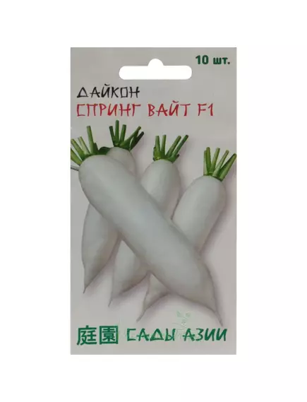 Дайкон Спринг - это среднеспелый гибридный сорт, который характеризуется периодом вегетации от 60 до 70 дней и имеет высокую урожайность. Он отличается выравненными, длинными корнеплодами цилиндрической формы с белоснежной мякотью, которая отличные вкусовые качества. Рекомендуется для употребления в свежем и обработанном виде, а также для непродолжительного хранения. Он также устойчив к цветушности и может быть посеян в два срока - в конце апреля и середине июля. Семена могут сохраняться жизнеспособными в течение нескольких лет после сбора.