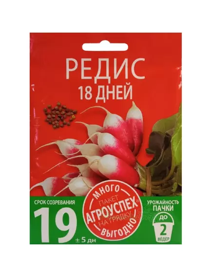 Суперраннеспелый сорт, созревает через 18-21 день после посева. Корнеплоды цилиндрические длиной 5-6 см, красные с белым кончиком, массой 17-20 г. Мякоть белая, сочная, вкусная, нежная, неострая. Устойчив к цветушности. Отличается дружной отдачей урожая. Предназначен для выращивания в открытом грунте для получения очень ранней продукции. В качестве ранней зелени в салаты можно употреблять листья редиса.