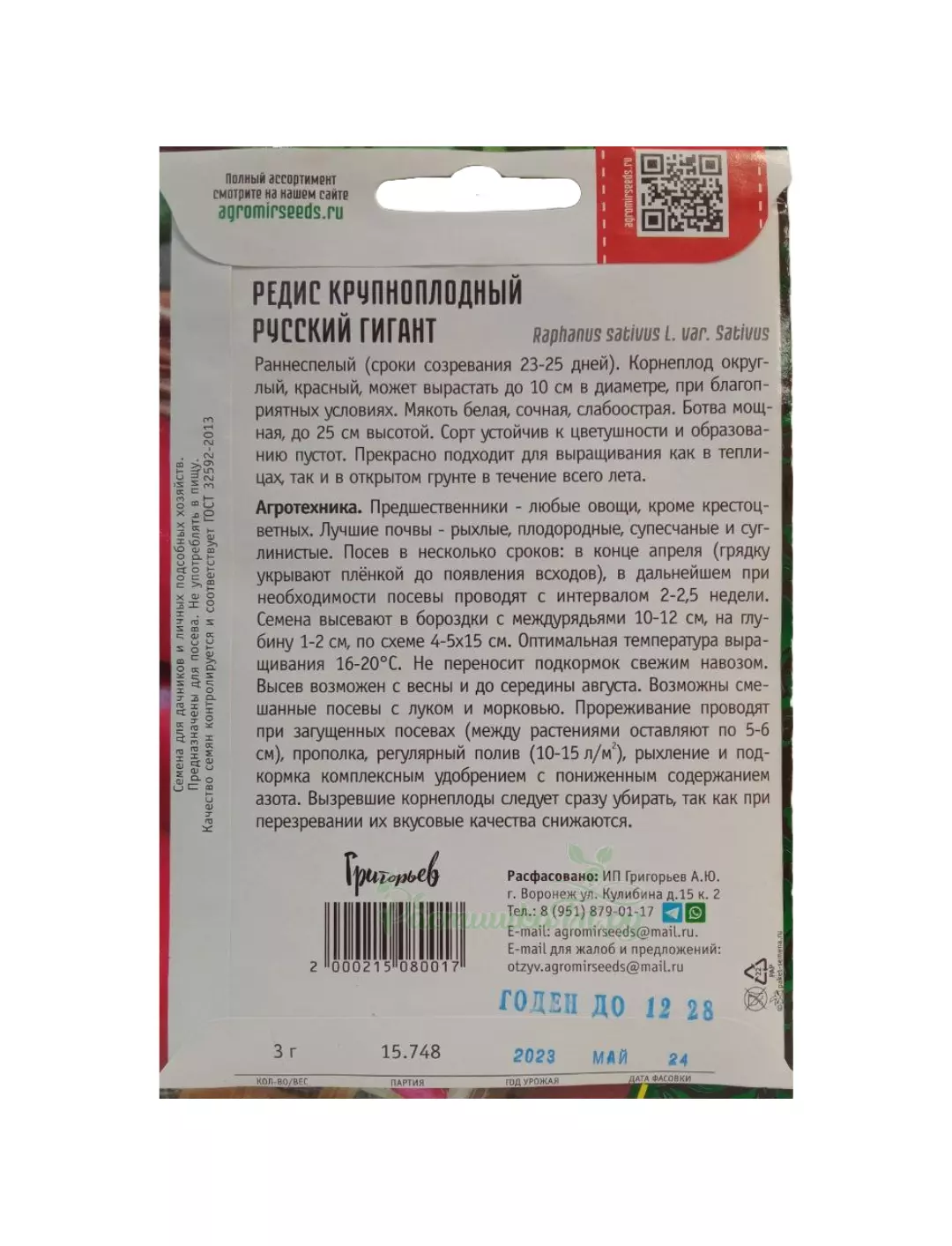 Позднеспелый сорт. Корнеплод эллиптический, массой 50-90 г., белый. Мякоть белая, нежная, с хорошим вкусом. Использование в осенне-зимний период, сохранность в хранилище до 5 месяцев. Под выращивание редиса отводят рыхлые, плодородные, супес-чаные или легкосуглинистые почвы. На бедных, тяжелых и кислых почвах хороший урожай высокого качества не вырастает. Редис требователен к свету, в тени дает длинную ботву и маленький корнеплод. Для получения максимального урожая редиса необходимо строгое соблюдение севооборота - не сажать его после крестоцветных. Возможны смешанные посевы редиса с морковью и луком. Посев проводят с начала апреля до середины августа. Семена всходят при температуре 16-18C на 5-6 день.