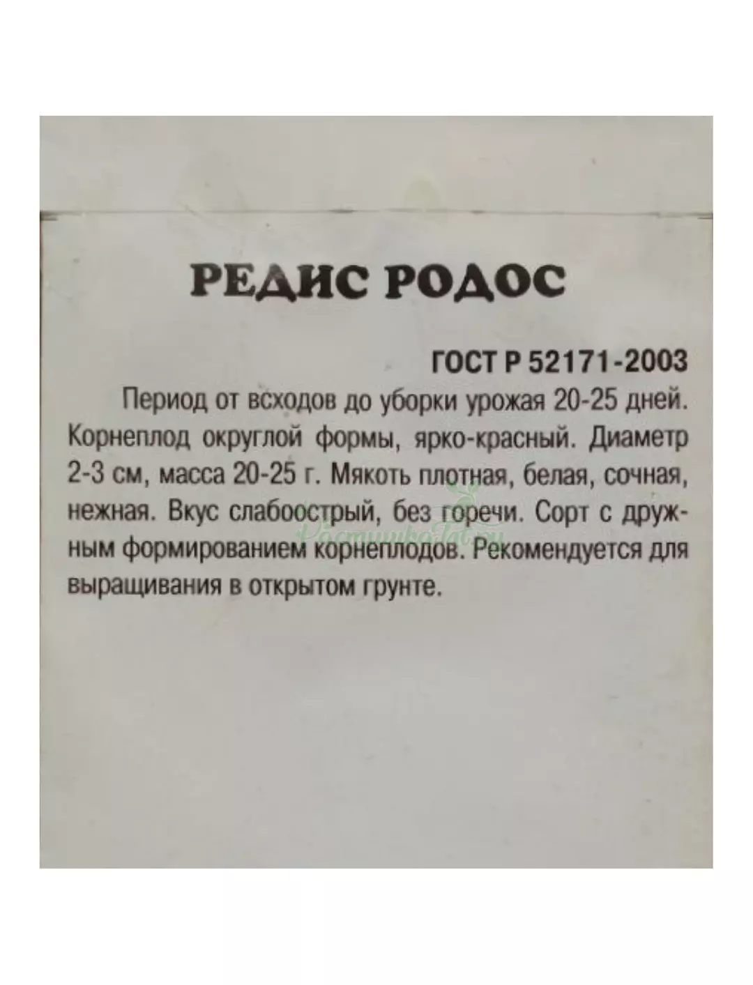 Период от всходов до уборки урожая 20-25 дней. Корнеплод округлой формы, ярко-красный. Диаметр 2-3 см, масса 20-25 г. Мякоть плотная, белая, сочная, нежная. Вкус слабоострый, без горечи. Сорт с дружным формированием корнеплодов. Рекомендуется для выращивания в открытом грунте.