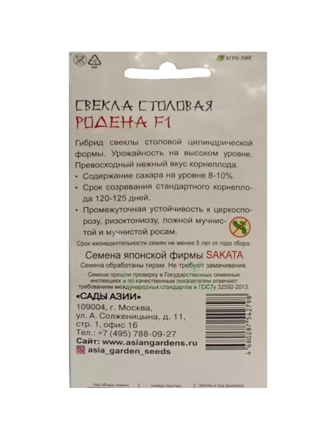 Гибрид свеклы столовой цилиндрической формы. Урожайность на высоком уровне. Превосходный нежный вкус корнеплода. Содержание сахара на уровне 8-10%. Срок созревания стандартного корнеплода 120-125 дней. Промежуточная устойчивость к церкоспорозу, ризоктониозу, ложной мучнистой и мучнистой росам.