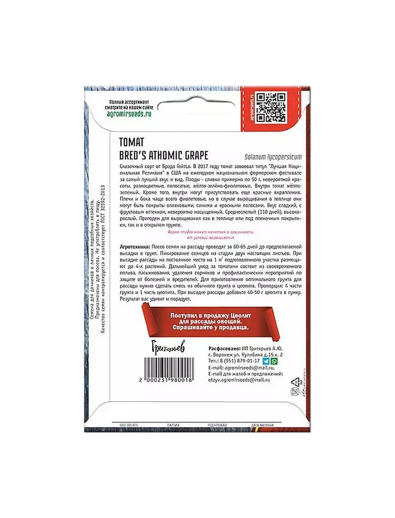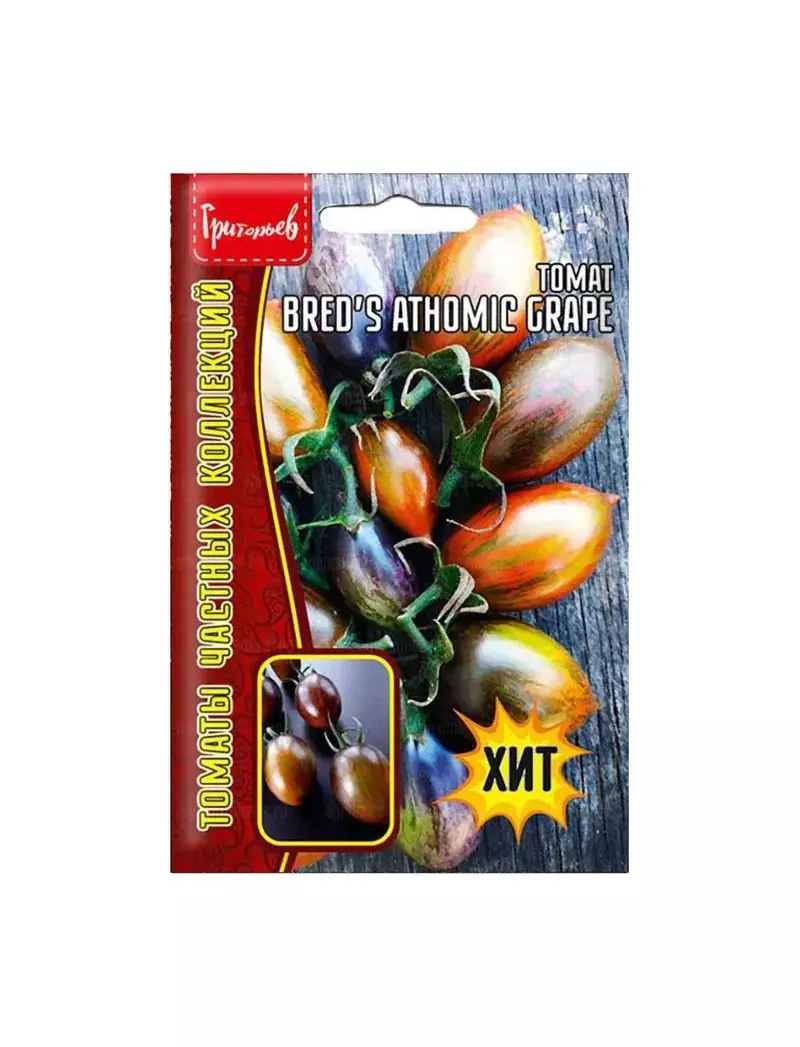 Американский сорт "Атомный виноград (гроздь) Брэда" (Brad’s Atomic Grape). Сорт индетерминантный, среднеранний, урожайный, некрупный, короткие сложные кисти напоминают грозди винограда. Стебли средней толщины, формировать лучше в 3-4 стебля. Плод «сливка» 40- 50 г, фиолетовое пятно растекающейся лавой обволакивает плод, оттенки лавандового и пурпурного полос, созревая, превращаются в красно-коричневые с антоциановыми полосами. На срезе плод жёлто-зелёный с красными мазками, нежно-сладкий, с кисти не осыпается, хорошо хранится после сбора урожая. Универсальный. Но вяленый - это точно сухофрукт. Сорт, как застывшая эмоция, он производит неизгладимое впечатление. Чувство восторга, не покинет вас до конца сезона