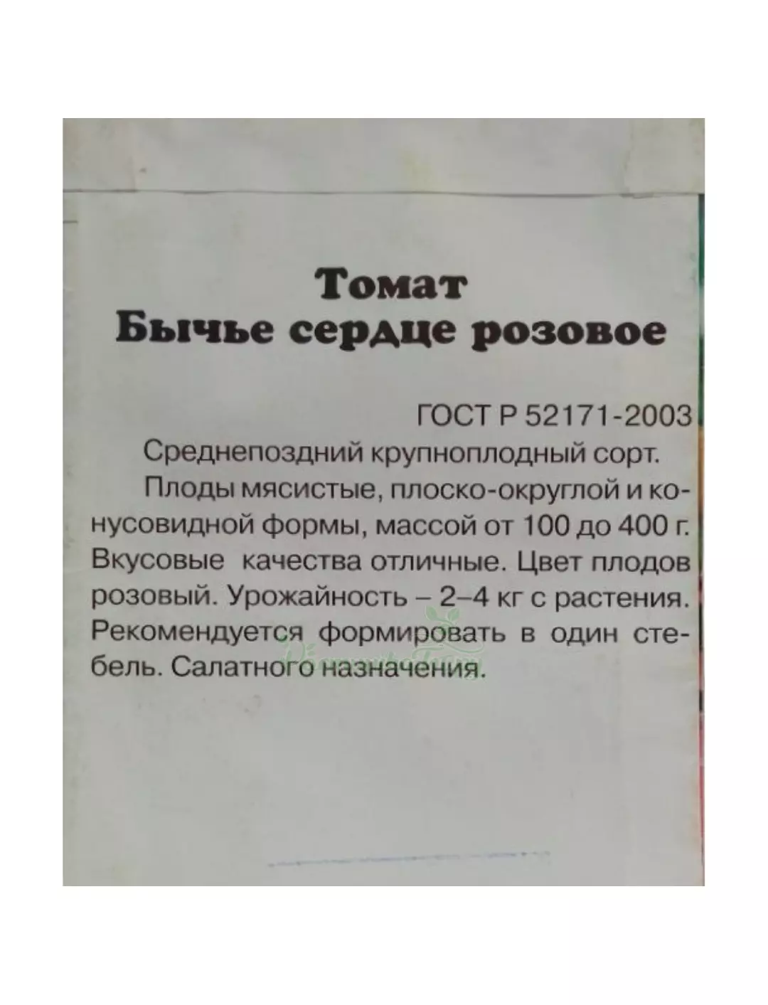 Плоды мясистые, плоско-округлой и конусовидной формы, массой от 100 до 400 г. Вкусовые качества отличные. Цвет плодов розовый. Рекомендуется формировать в один стебель. Салатного назначения.