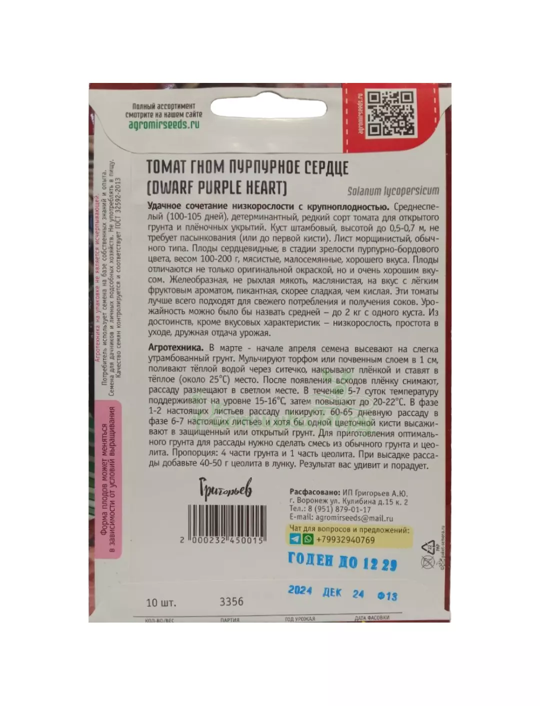 Томат Гном Пурпурное Сердце - это удачное сочетание низкорослости и крупноплодности. Это среднеспелый (период созревания 100-105 дней), детерминантный высотой до 50-70 см, не требуют пасынкования до первой кисти, предназначенный для выращивания в открытом грунте или под пленочным укрытием. Плоды сердцевидной формы, созревая становятся пурпурно-красными, весят от 100 до 200 граммов. Они мясистые и малосеменные, с очень хорошим вкусом и ароматом. Лучше всего подходят для употребления в свежем виде и приготовления соков. С одного куста можно собрать до 2 килограммов плодов. Гном Пурпурное Сердце отличается не только вкусовыми качествами, но и простотой в уходе, а также дружным плодоношением.