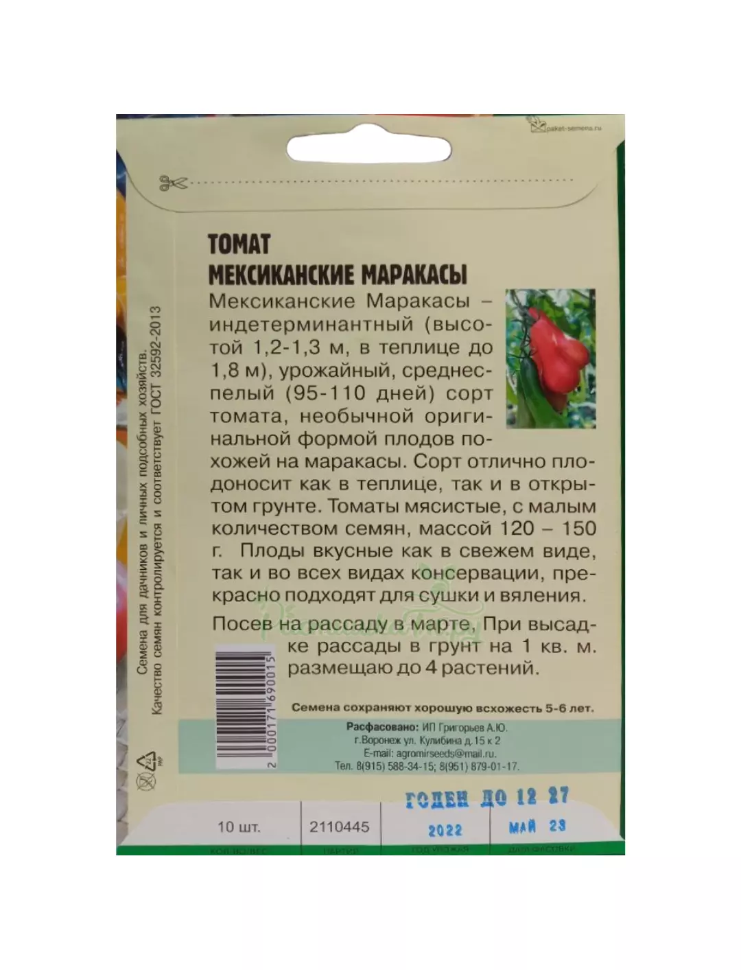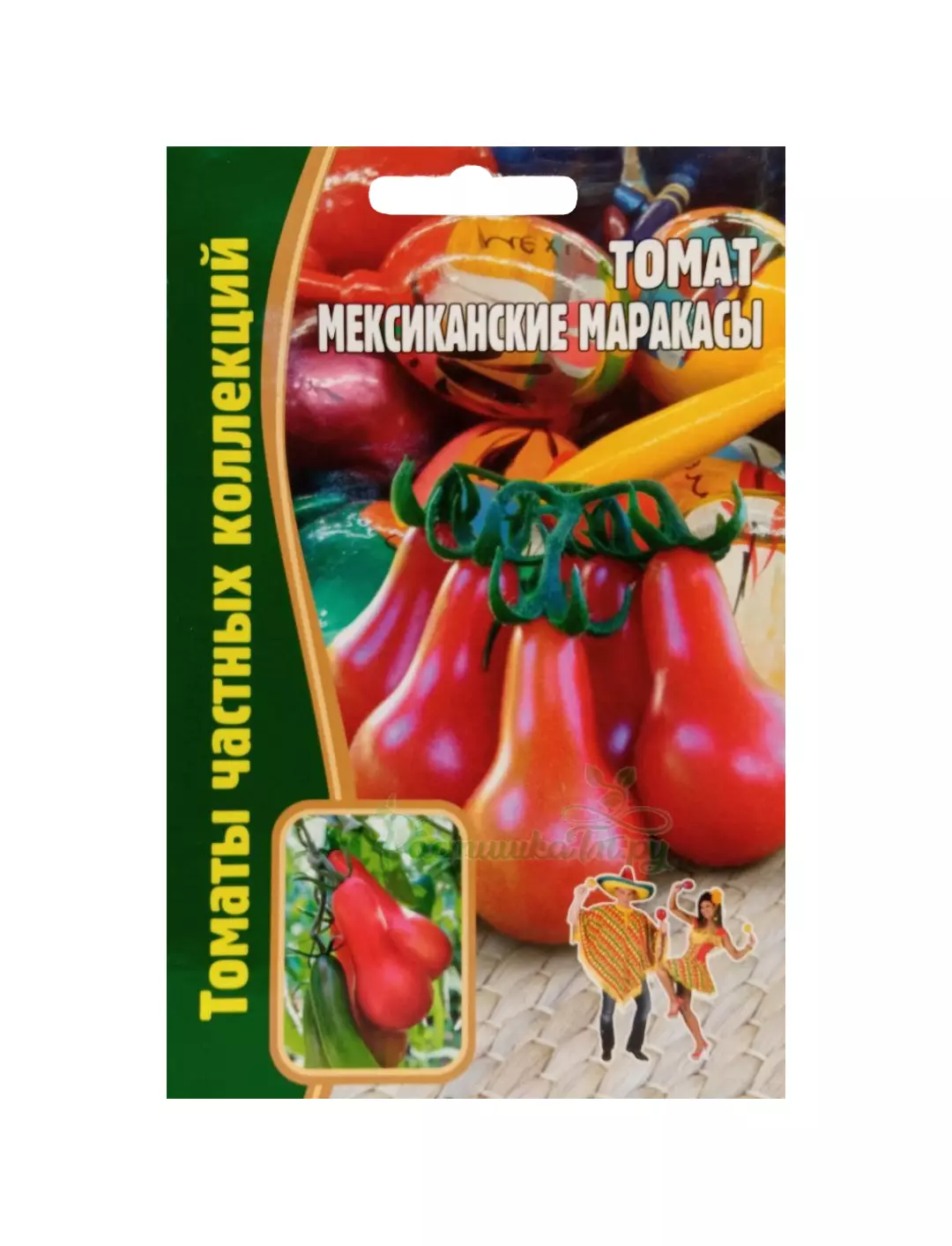 Индетерминантный (высотой 1.2-1.3м, в теплице до 1.8м), урожайный, среднеспелый (95-110дней) сорт томата, необычной оригинальной плодов похожей на маракасы. Сорт отлично плодоносит как в теплице, так и в открытом грунте. Томаты мясистые, с малым количеством семян, массой 120-150г. Плоды вкусные как в свежем виде, так и вов всех видах консервации, прекрасно подходят для сушки и вяления.