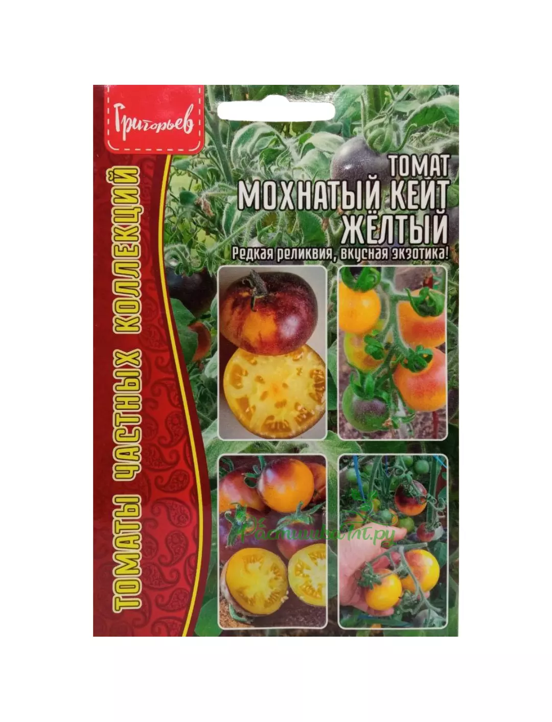 Детерминантный, среднеспелый, экзотический сорт с опушёнными голубыми листьями и стеблями.Плоды густо-фиолетовые у плодоножки, при полном созревании ярко-желтые с фиолетовым муаром. Повышенное содержание антоциана придаёт плодам эту тёмную окраску. Они не только очень красивы, но и полезны, благодаря присутствию мощного антиоксиданта! Плоды покрыты лёгким опушением, средней массой 60-80 гр. Редкий сорт! Вкус отличный. Сорт Мохнатый Кейт выращивают рассадным способом. Посев семян проводят за 60—65 дней до предполагаемой даты высадки саженцев в грунт. На 1 м2 рекомендуется располагать не больше 4 кустов, чтобы удобно проводить полив, окучивание, внесение подкормок.