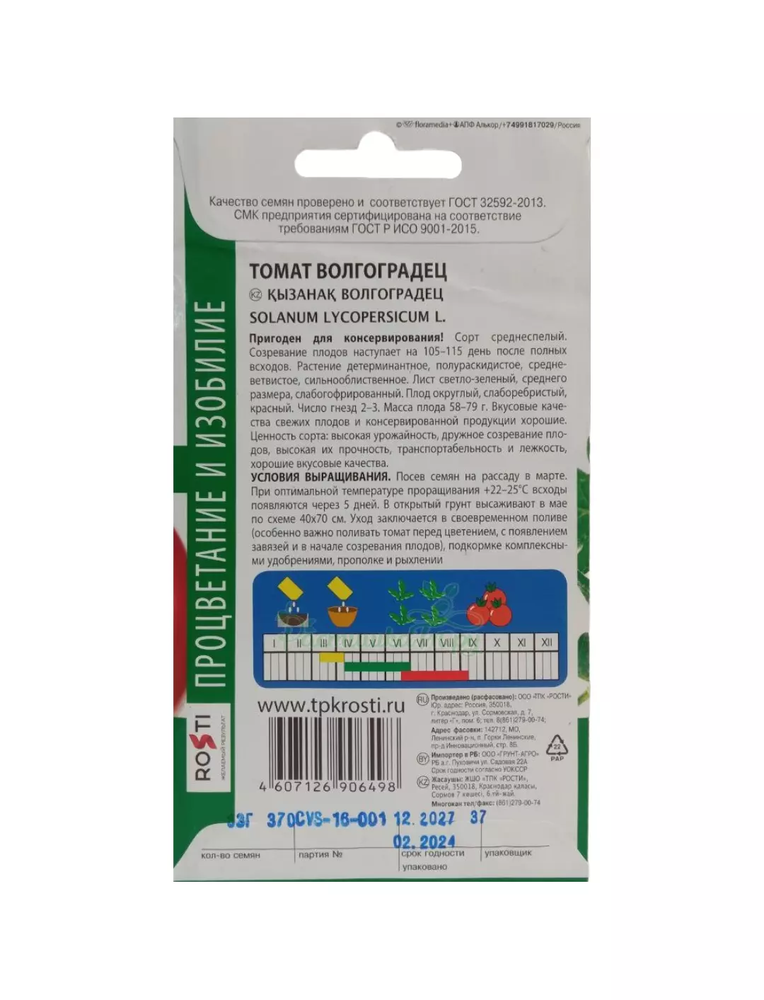 Сорт среднеспелый. Созревание плодов наступает на 105-115 день после полных всходов. Растение детерминантное, полураскидистое, средневетвистое, сильнооблиственное. Лист светло-зеленый, среднего размера, слабогофрированный. Плод округлый, слаборебристый, красный. Число гнезд 2-3. Масса плода 58-79 г. Вкусовые качества свежих плодов и консервированной продукции хорошие. Ценность сорта: высокая урожайность, дружное созревание плодов, высокая их прочность, транспортабельность и лежкость, хорошие вкусовые качества.