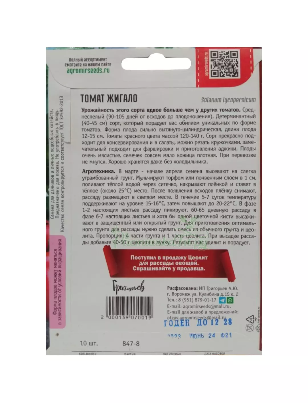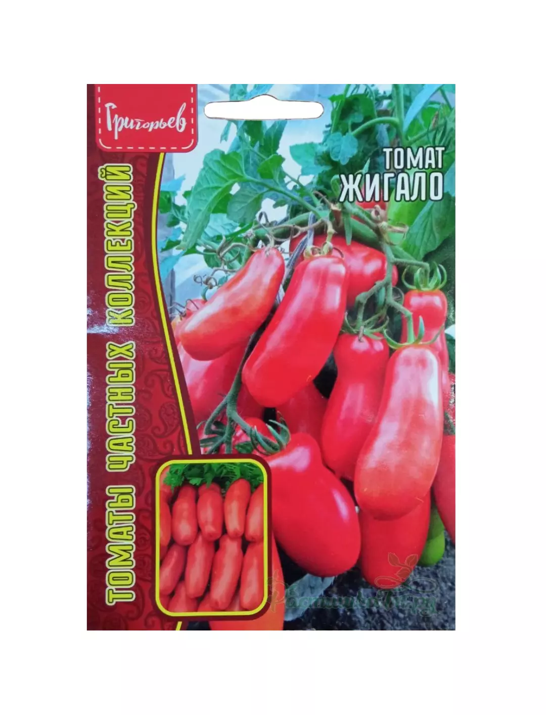 Среднеспелый (90-105 дней от всходов до плодоношения). Детерминантный (40-45 см) сорт, который порадует вас обилием уникальных по форме томатов. Урожайность этого сорта вдвое больше чем у других томатов. Форма плода сильно-вытянуто-цилиндрическая — длина плода 12-15 см, диаметр 34 см красного цвета массой 120-140 г. Жигало прекрасно подходит для консервирования в салаты можно резать кружочками замечательный сорт для фаршировки и приготовления аджики. Плоды очень мясистые, семечек совсем мало кожица плотная. При перевозке не мнутся. Хорошо хранятся даже без холодильника. Нет каких-то особенных секретов по выращиванию сорта Жигало. При разведении томатов применяются рассадный и безрассадный способы. Посадка семян в открытый грунт. При такой технологии выращивания томатов сначала проводят проращивание семян. Таким образом можно добиться более раннего прорастания сеянцев томатов сорта Жигало. Для проращивания семян их кладут в полотняный мешочек и примерно на 12 часов опускают в теплую воду. Чтобы семена не остывали, воду периодически меняют. Проращенные семена по две штуки закапывают в лунках, выкопанных на специально подготовленном участке. Семена сохраняют хорошую всхожесть 5-6 лет.