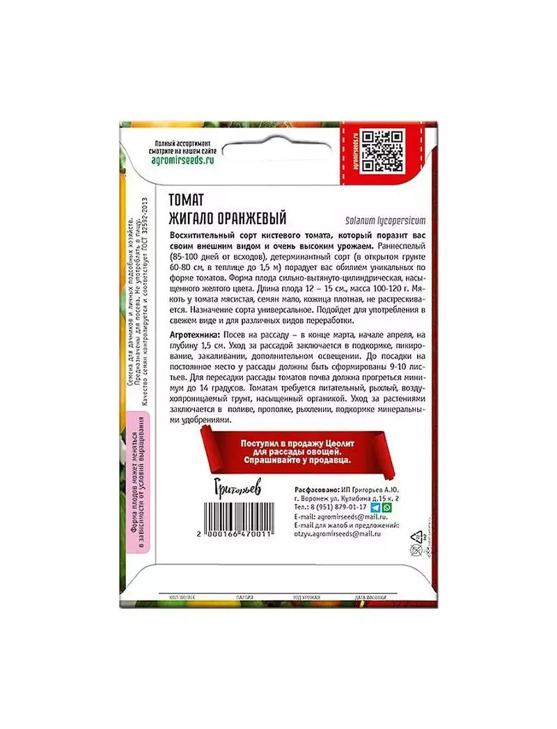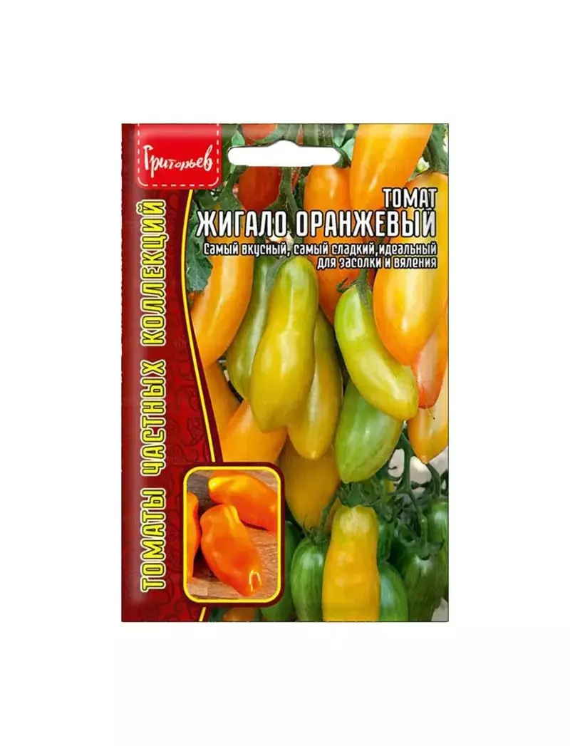 Среднеспелый (90-105 дней от всходов до плодоношения). Детерминантный (40-45 см) сорт, который порадует вас обилием уникальных по форме томатов. Урожайность этого сорта вдвое больше чем у других томатов. Форма плода сильно-вытянуто-цилиндрическая — длина плода 12-15 см, диаметр 34 см.. оранжевого цвета массой 120-140 г. Жигало прекрасно подходит для консервирования в салаты можно резать кружочками замечательный сорт для фаршировки и приготовления аджики. Плоды очень мясистые, семечек совсем мало кожица плотная. При перевозке не мнутся. Хорошо хранятся даже без холодильника. Нет каких-то особенных секретов по выращиванию сорта Жигало. При разведении томатов применяются рассадный и безрассадный способы. Посадка семян в открытый грунт. При такой технологии выращивания томатов сначала проводят проращивание семян. Таким образом можно добиться более раннего прорастания сеянцев томатов сорта Жигало. Для проращивания семян их кладут в полотняный мешочек и примерно на 12 часов опускают в теплую воду. Чтобы семена не остывали, воду периодически меняют. Проращенные семена по две штуки закапывают в лунках, выкопанных на специально подготовленном участке. Семена взяты из частной коллекции Лидии Ишимцевой, выращены на Уральской земле, без применения химикатов и собранные вручную с любовью. Семена сохраняют хорошую всхожесть 5-6 лет.