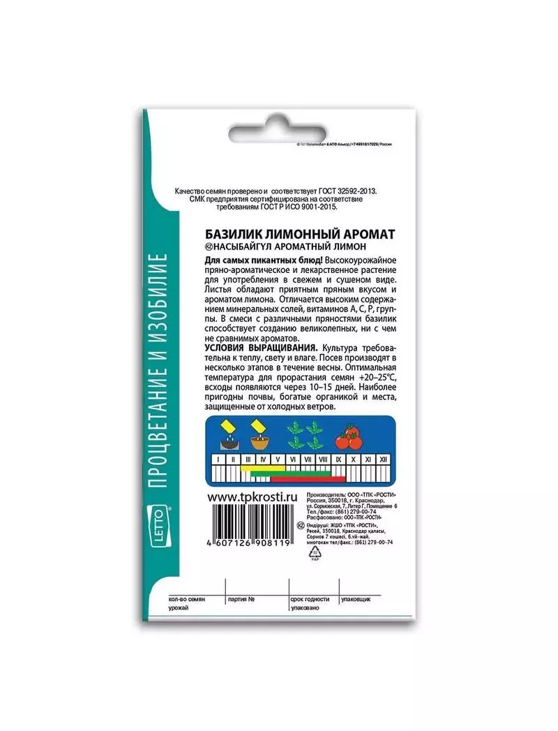 Высокоурожайное пряно-ароматическое и лекарственное растение для употребления в свежем и сушеном виде. Листья обладают приятным пряным вкусом и ароматом лимона. Отличается высоким содержанием минеральных солей, витаминов А, С, Р, группы. В смеси с различными пряностями базилик способствует созданию великолепных, ни с чем не сравнимых ароматов.