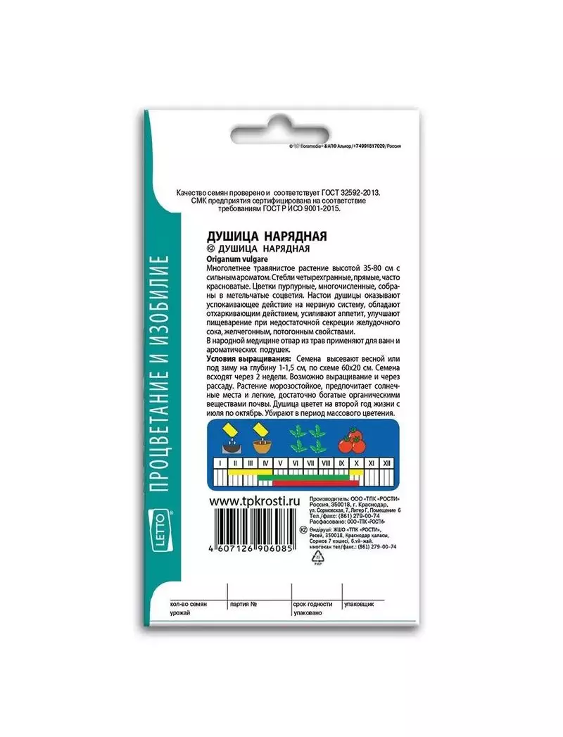 Многолетнее травянистое растение высотой 35-80 см с сильным ароматом. Стебли четырехгранные, прямые, часто красноватые. Цветки пурпурные, многочисленные, собраны в метельчатые соцветия. Настои душицы оказывают успокаивающее действие на нервную систему, обладают отхаркивающим действием, усиливают аппетит, улучшают пищеварение при недостаточной секреции желудочного сока, желчегонным, потогонным свойствами. В народной медицине отвар из трав применяют для ванн и ароматических подушек.