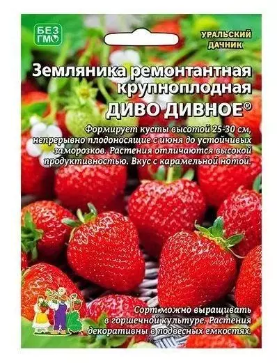 Земляника Диво Дивное – это один из самых ранних и универсальных ремонтантных сортов. Он подходит для выращивания в разных климатических условиях и дает стабильный урожай сладких ягод, в том числе в северных широтах благодаря высокой морозостойкости. Кусты компактные, высотой до 25-30 см с цветоносами ниже уровня листьев. Они ярко-красные, конусовидные, среднего размера до 25-35 грамм и до 1,1-1,5 кг ягод с одного куста. Мякоть плотная и сочная, кожица ярко-красная, блестящая. Сорт отличается отменной лежкостью и способностью к длительному хранению.
