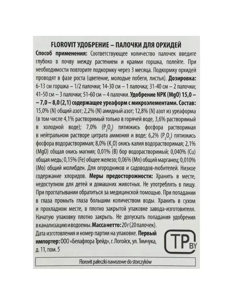 Комплексное удобрение длительного действия как подкормка для орхидей и лиановых растений. Палочки удобрительные Florovit являются наиболее подходящим средством для орхидей. Флоровит обладает комплексом микро- и макроэлементов и обеспечивает долговечность и здоровье растения, защищает от болезней.
