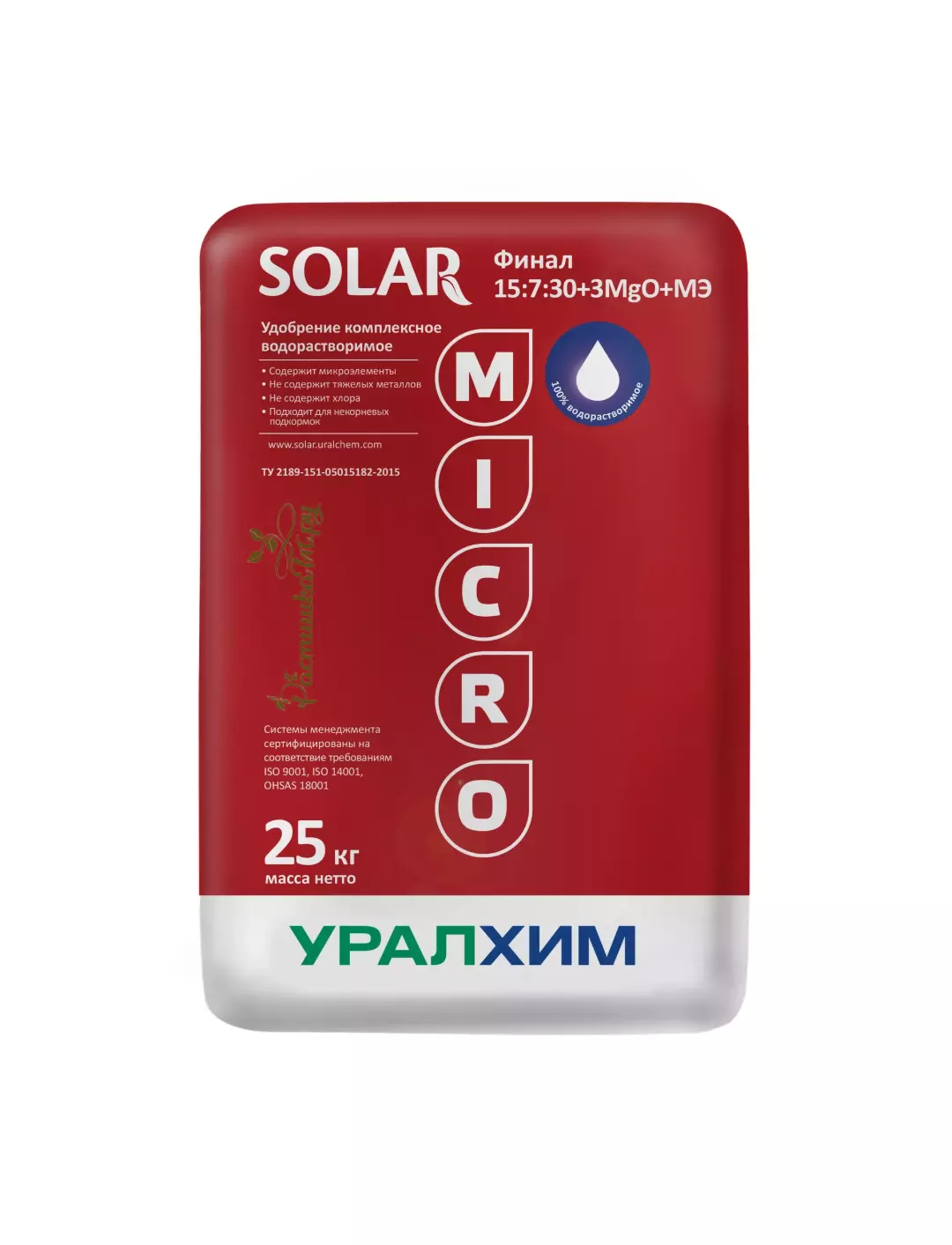 УРАЛХИМ SOLAR Финал 15.7.30+3MgO+МЭ – это высокоэффективное, полностью водорастворимое комплексное удобрение, специально разработанное для завершающих стадий развития растений: активного налива, созревания плодов и подготовки к уборке урожая. Его уникальная формула с преобладанием калия и достаточным содержанием магния, обогащенная полным комплексом микроэлементов, гарантирует максимальное качество, вкус, аромат и срок хранения вашей продукции.