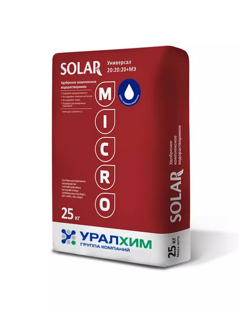 УРАЛХИМ SOLAR Универсал 20.20.20+МЭ – это высокоэффективное, полностью водорастворимое комплексное удобрение с идеально сбалансированной формулой NPK, предназначенное для универсального применения на всех стадиях развития растений. Благодаря равному содержанию азота, фосфора и калия, обогащенному полным комплексом микроэлементов в хелатной форме, это удобрение является незаменимым помощником для поддержания здорового роста, пышного цветения и формирования качественного урожая для широкого круга культур.