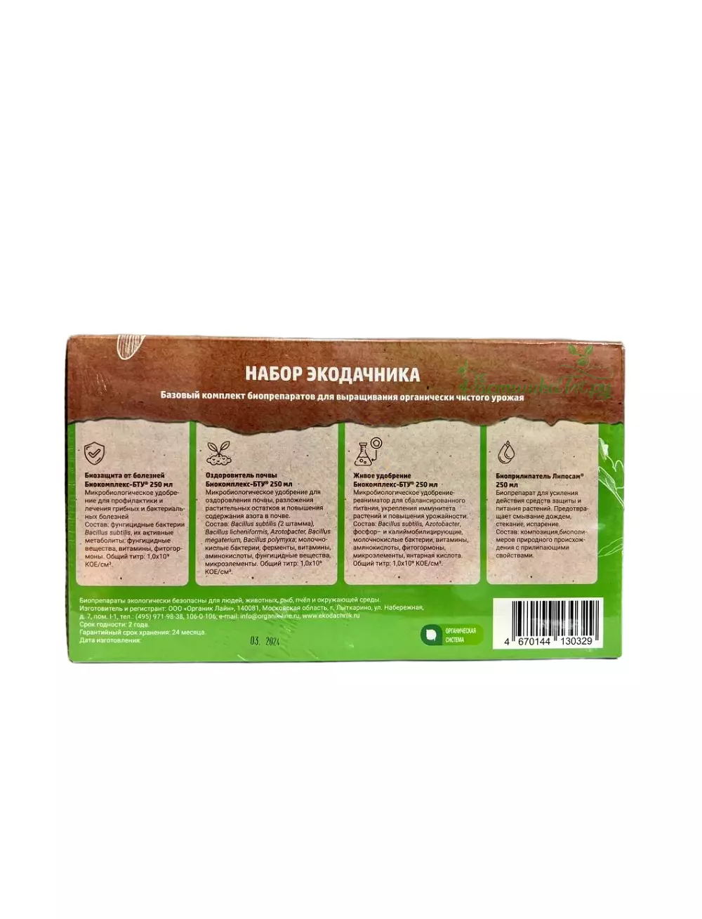 Набор Экодачника из 4 удобрений - это 4 биопрепарата для выращивания экологически чистых овощей и фруктов на своем участке. В него входят: Биозащита от болезней, Живое удобрение, Оздоровитель почвы и биоприлипатель Липосам, которые помогут Вам исключить применение химии в саду и на огороде. Препараты полностью безопасны для людей, домашних животных и окружающей среды. Продукция, выращенная с их помощью, считается экологически чистой. В составе Биокомплексов-БТУ входит специальный комплекс полезных бактерий для решения разных задач: биозащиты от грибных и бактериальных болезней (Биозащита от болезней), восстановление плодородия (Оздоровитель почвы) и сбалансированного питания (Живое удобрение), усиление и закрепление средств защиты на растениях(Липосам). Применять можно от обработки семян и до сбора экологически чистого урожая овощных и плодово-ягодных культур. Действовать согласно инструкции на этикетке.