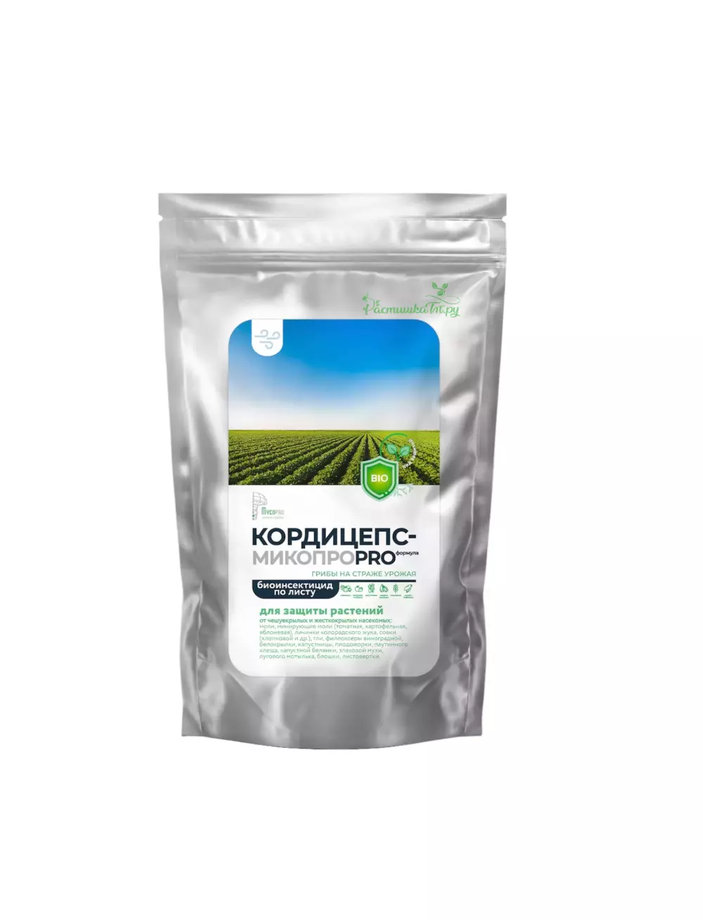 Кордицепс по листу - биоинсектоакарицид кишечно-контактного действия для защиты растений от чешуекрылых и жесткокрылых.