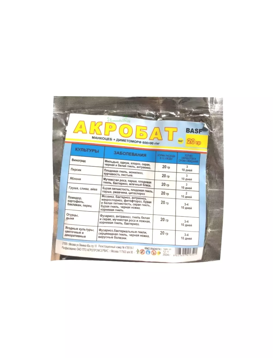 Акробат - фунгицид нового поколения. В его состав входят 2 активно действующих вещества - манкоцеб и диметоморф. Манкоцеб оказывает профилактическое действие, подавляя и останавливая жизнедеятельность грибковых возбудителей заболевания. Диметоморф уничтожает бактерии-возбудители изнутри растения. Препарат не вызывает выработку антител у болезнетворных возбудителей, следственно и привыкание. Выпускается в гранулах для наиболее удобного использования.