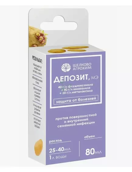 «Депозит» — эффективный фунгицидный протравитель для предпосевной обработки клубней картофеля. Он обеспечивает надёжную защиту от семенной и почвенной инфекций, стимулирует рост вегетативной массы и контролирует широкий спектр патогенов. Благодаря инновационной формуле препарат обеспечивает максимально быстрый защитный эффект.