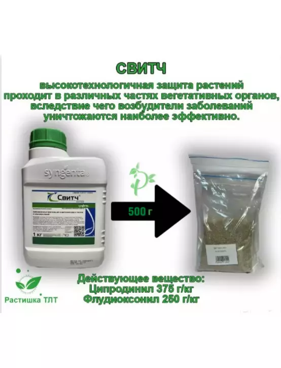 Свитч - высокоэффективное средство против серой гнили на овощах, ягодах, фруктовых деревьев и цветов. Препарат воздействует на четыре стадии развития патогена, защищая его от проникновения.