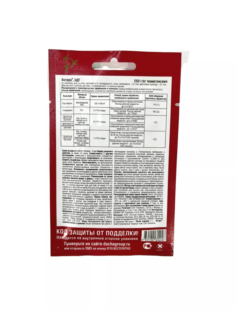 Картофель: Колорадский жук 0,6 г / 100 м2 Опрыскивание в период вегетации.Расход рабочей жидкости - до 4 л /100 м2Срок ожидания (кратность обработок): 14 (1) Смородина Тли 2 г / 10 л воды Опрыскивание до цветения или после сбора урожая.Расход р